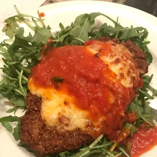 - Crispy, breaded chicken is topped with marinara sauce and melted cheese for a rich, satisfying meal.